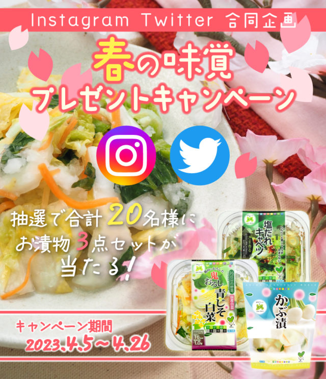 2023年4月5日~4月26日の期間中、当社の公式Instagramをフォロー&いいね、公式Twitterをフォロー&リツートしていただいた方の中から抽選で合計20名様に、お漬物3点セットが当たる「春の味覚プレゼントキャンペーン2023」を実施いたします。