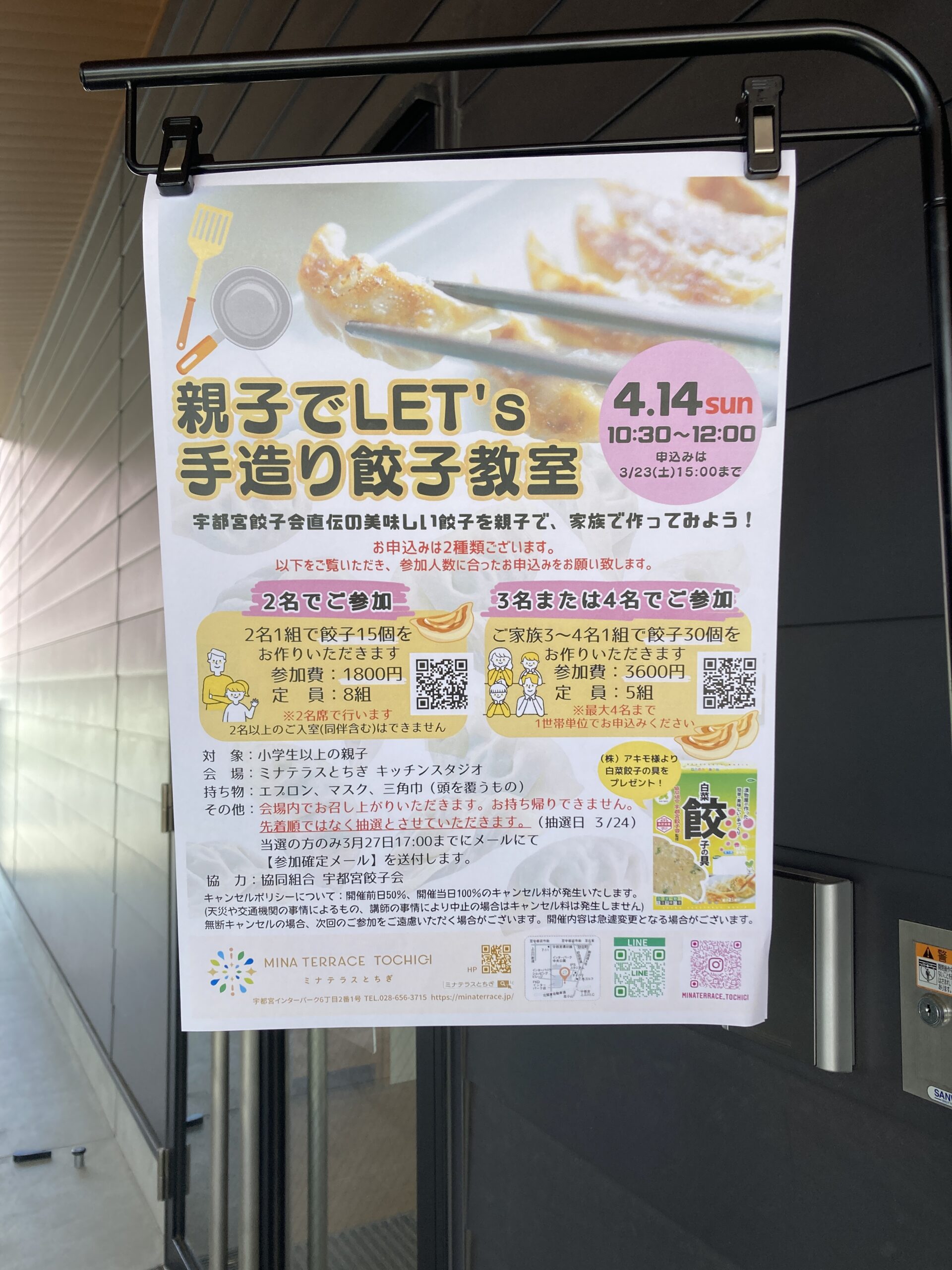 2024年4月14日(日)、ミナテラスとちぎ様主催、宇都宮餃子会様による「親子でLET’s手造り餃子教室」がミナテラスとちぎキッチンスタジオで開催され、14組(32名)の親子が楽しく参加されていました。