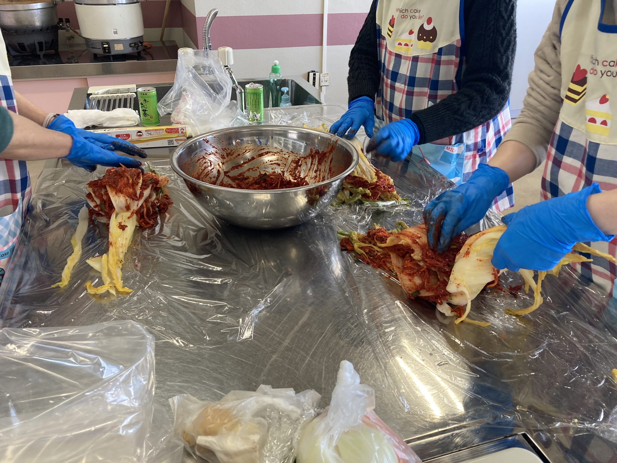 キムチ教室では、まず講師から直接、白菜下漬けの仕方を伝授いたします。次に、3~5人一組となり、大根、にんじん、たまねぎ、にら、にんにく……などの野菜を千切り・すりおろし、それらを数種類の調味料と一緒に混ぜ合わせ、キムチのタレを作ります。その後、あらかじめアキモ工場で漬け込んだ下漬け白菜をご提供し、そこにタレを丁寧に塗り込み完成です!作ったキムチはお持ち帰りいただき、ご家庭の冷蔵庫で熟成していただきながら、お好みの発酵タイミングで少しずつお楽しみいただくことができます。