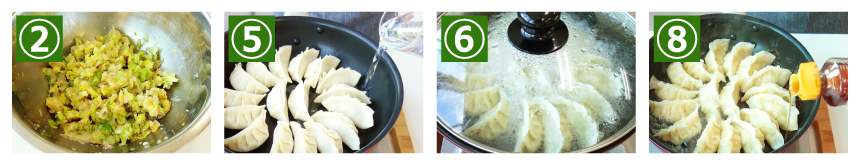 ⑤強火で熱し、餃子を返して焼き面が白く変化したことを確認したら、水を入れる。