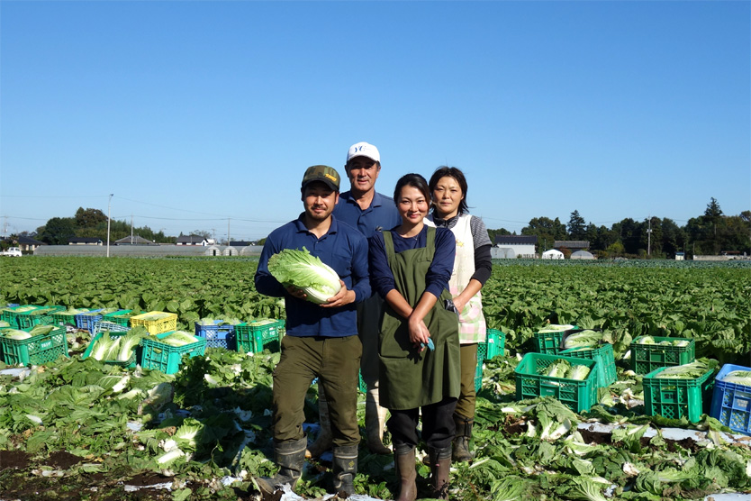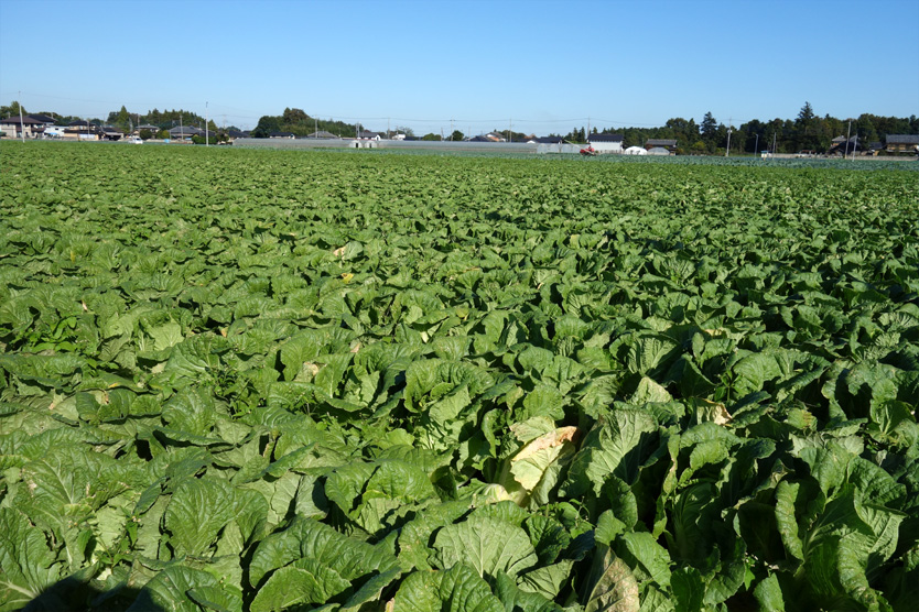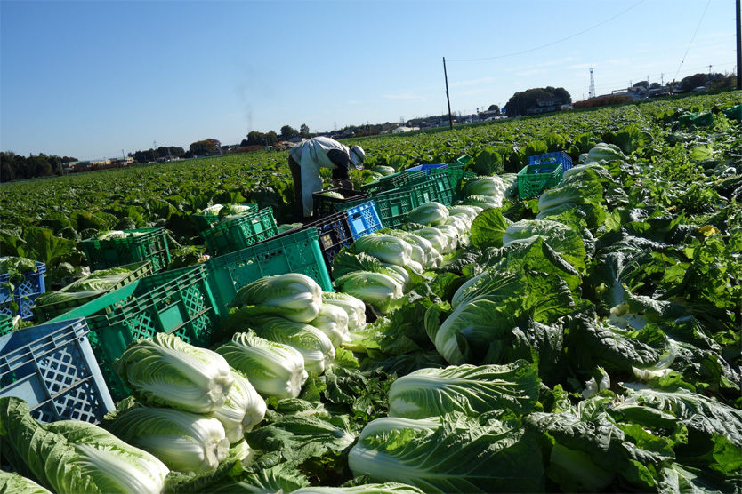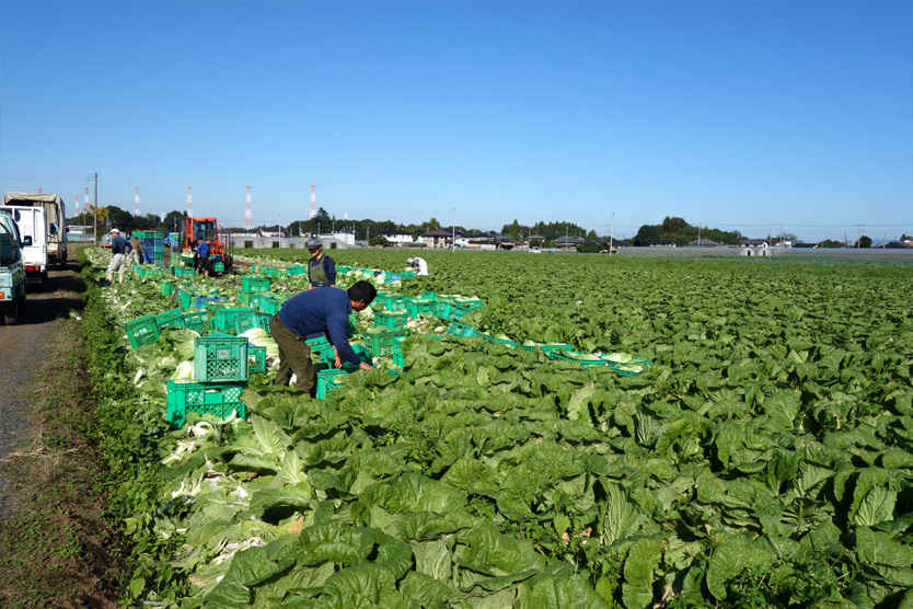 晴天の青空広がる11月のはじめに、収穫最盛期である茨城県古河市風見さんの白菜畑に伺いました。