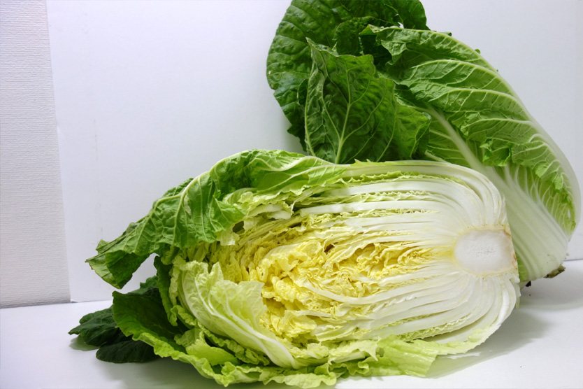 「あきめき」という品種の黄芯白菜(外の葉は緑色で中の葉が黄色の白菜)で、この時期に収穫できる白菜です。