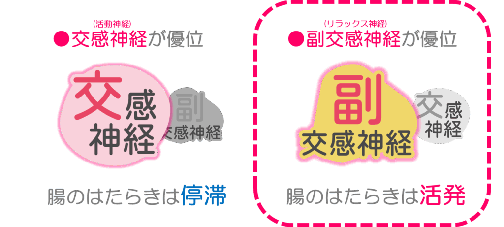 活動神経である『交感神経』が優位な時は、ぜん動運動は停滞しています。一方、リラックス神経である『副交感神経』が優位な時は、ぜん動運動が活発になります。したがって、排便は副交感神経が優位なときに起こりやすく、緊張状態が続き交感神経が優位なままの人は、ぜん動運動が鈍いために便秘になりやすくなります。