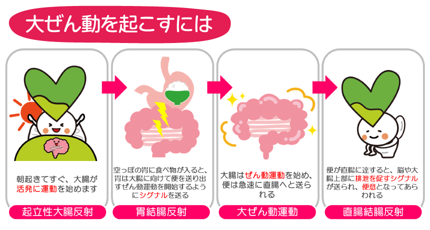 大ぜん動とは、大腸の動きによって便を体外に排出させるための動きをいい、通常1日に1〜2回起こり、多くは朝食後に起こります。