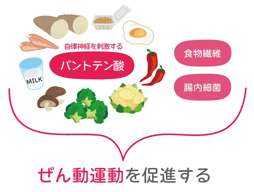ぜん動運動を食材で改善する方法としては、ビタミンB群の一つであるパントテン酸を含む食物を意識して摂るといいでしょう。