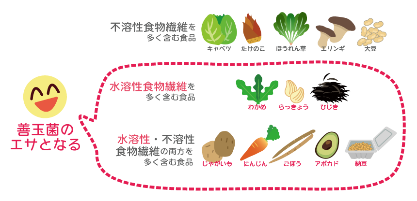 まずは善玉菌であるビフィズス菌・乳酸菌・酪酸菌の大好物である、水溶性食物繊維をたくさん摂取するのが良いでしょう。