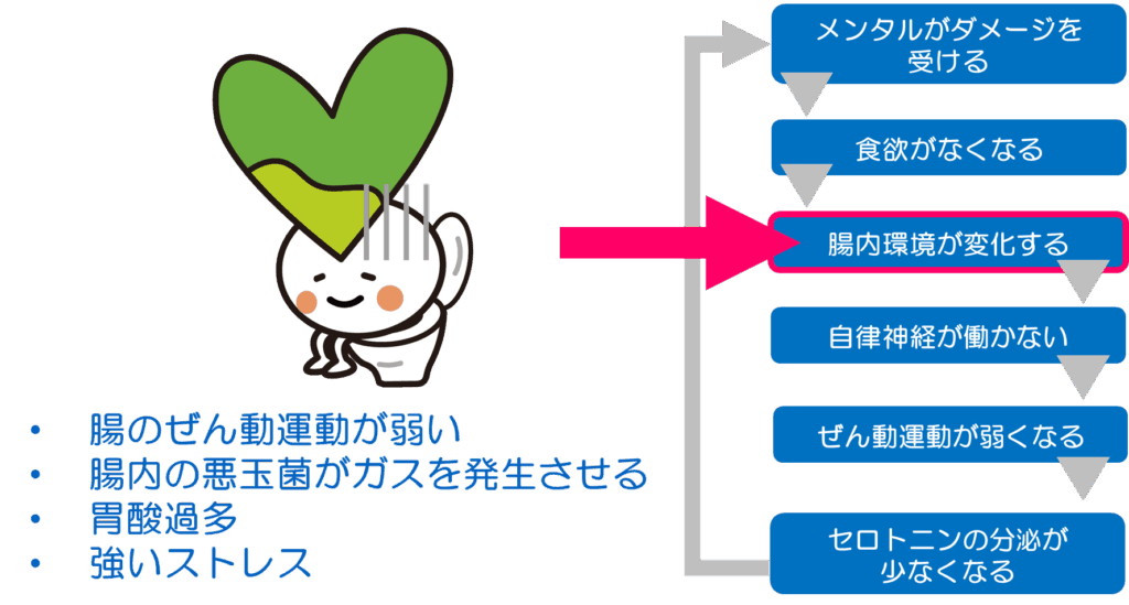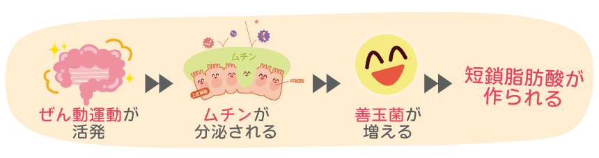 野菜や果物に含まれる水溶性食物繊維などをエサとして食べて、代謝して短鎖脂肪酸という物質を出します。